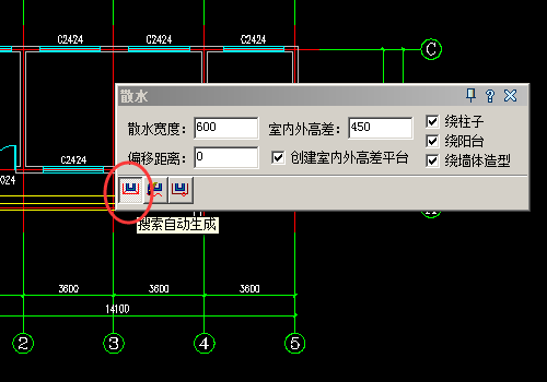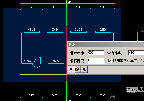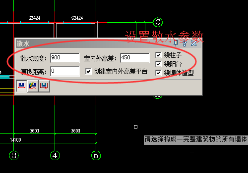 4、选择好以后我们设置散水的各项参数,首先设置散水的宽度900,室外高差设置为450。其他按照默认即可。