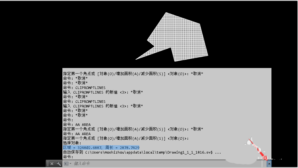 6、单击命令栏右边中”向上三角形符号“,我们可以查看到图形的面积和周长。