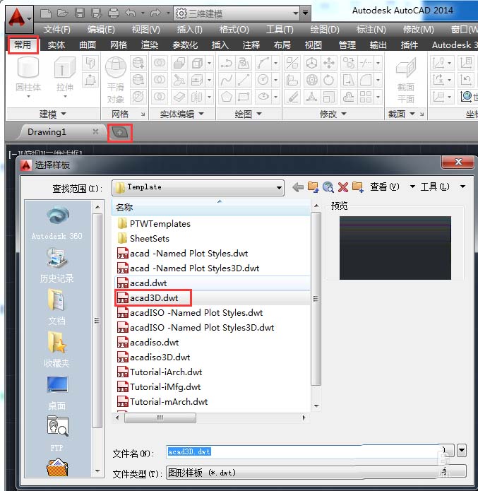 1、首先运行AutoCAD2014软件,打开【选择样板】对话框载入acad3D.dwt文件。