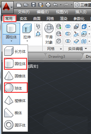 2、然后点击菜单栏【常用】》【建模】》【球体】和【圆柱体】选项。