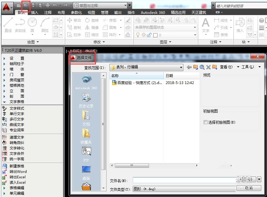 2、然后【选择文件】对话框载入绘制好的表格文件,点击【打开】按钮。