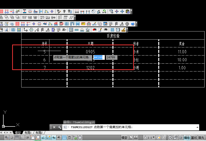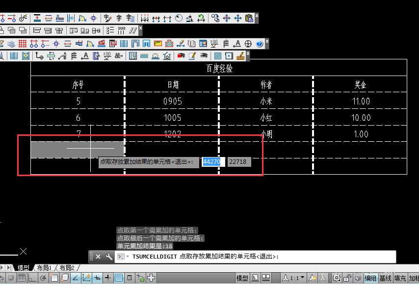 4、点击【单元累加】按钮后,根据信息提示移动鼠标左键在单元格中点取第一个需要累加的单元格。