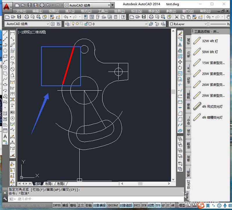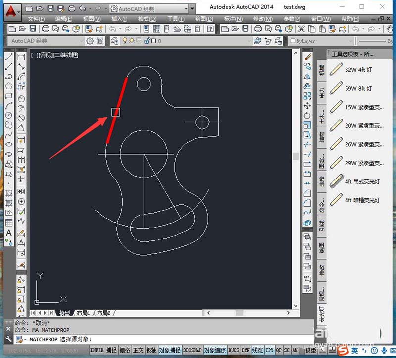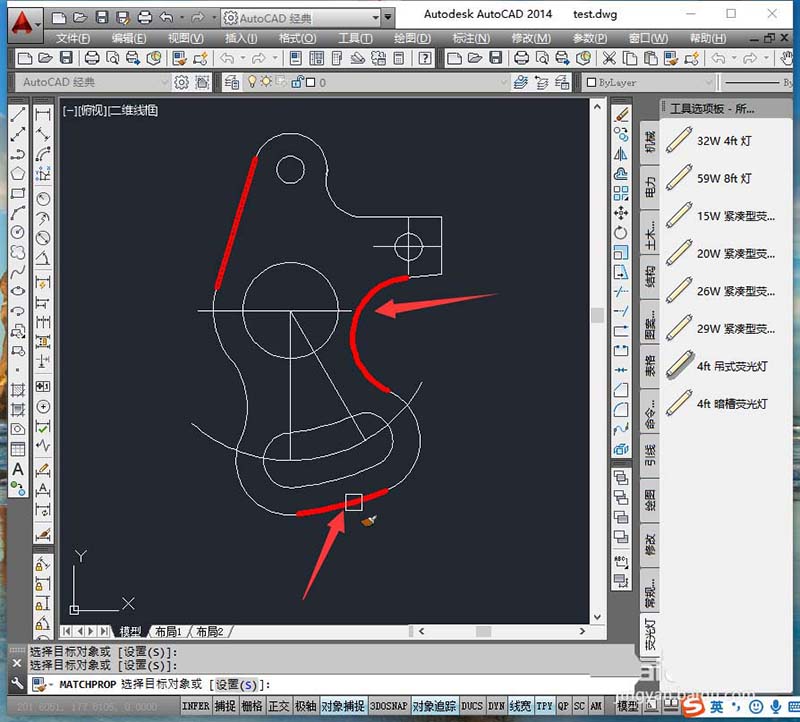 1、打开图纸,我们要将图形中的 红色直线和这条直线的线宽复制到别的图形上。