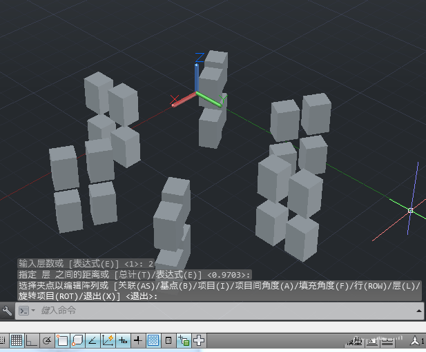 7、然后根据信息提示输入相关行数、列数、层数以及各间距值,按回车即可完成三维阵列。