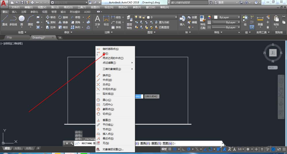 4、选择矩形,然后在绘图局域按下shift+鼠标右键选择自命令,捕捉端点如图: