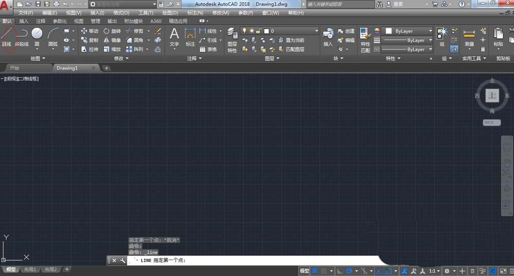 2、点击绘图局域任何位置,单击l表示输入直线,也可以直接点击左上角的直线选项如图: