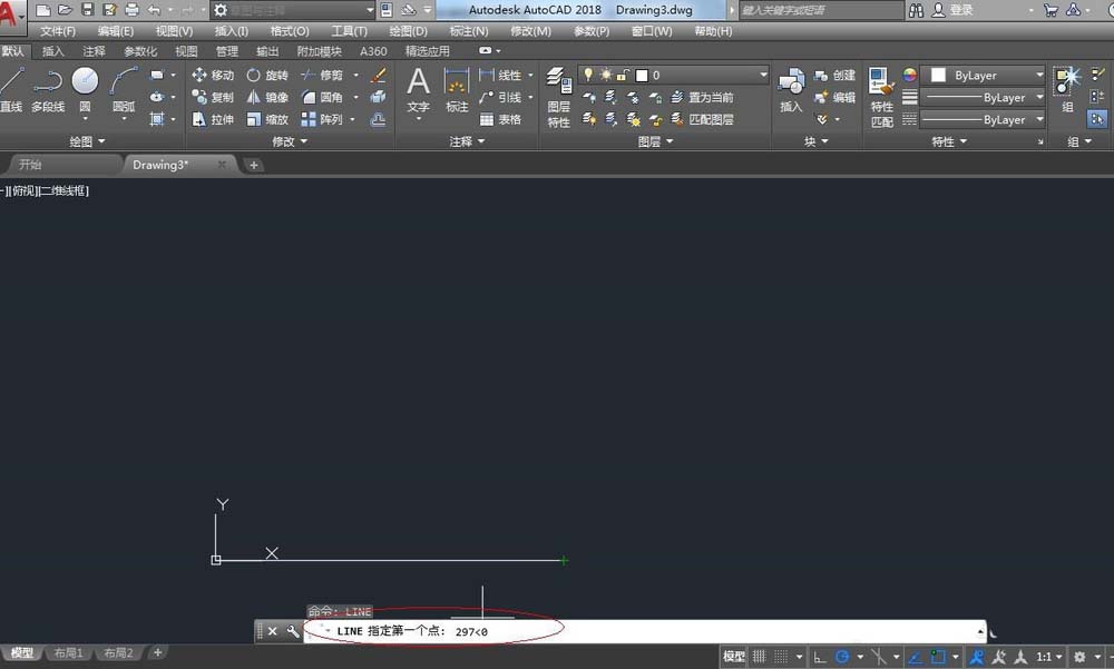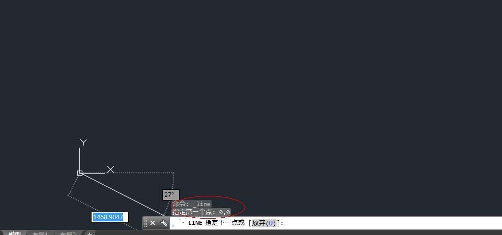 3、在下面的指令栏中输入0,0表示从坐标原点开始如图:
