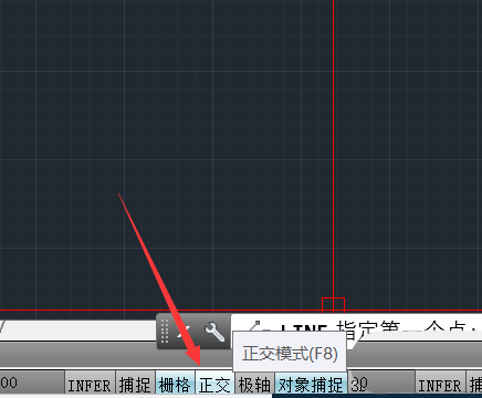 1、首先,打开cad,如图所示,点击打开下方的正交 功能选项,然后进入正交模式之后,在图中绘制两条相交的直线,作为xy轴线。