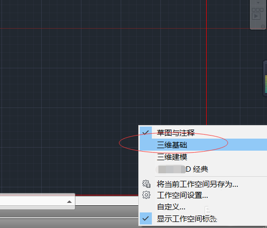 3、然后在cad中,点击右下角工作区间切换快捷栏,如图所示,点击进入三维基础即可开始绘制三维图形。