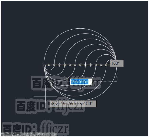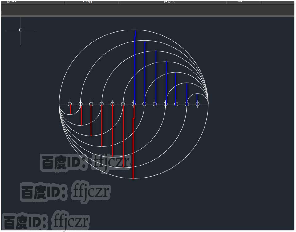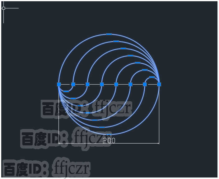 7、因为,其它的圆弧创建方法和上面的相同,就不一一细说了。所不同的是选择圆心和终点。可以参考下图所给的辅助色线。就是所等分出来的每个节点都成了圆弧的圆心。最后得到这样一个规律的曲线。