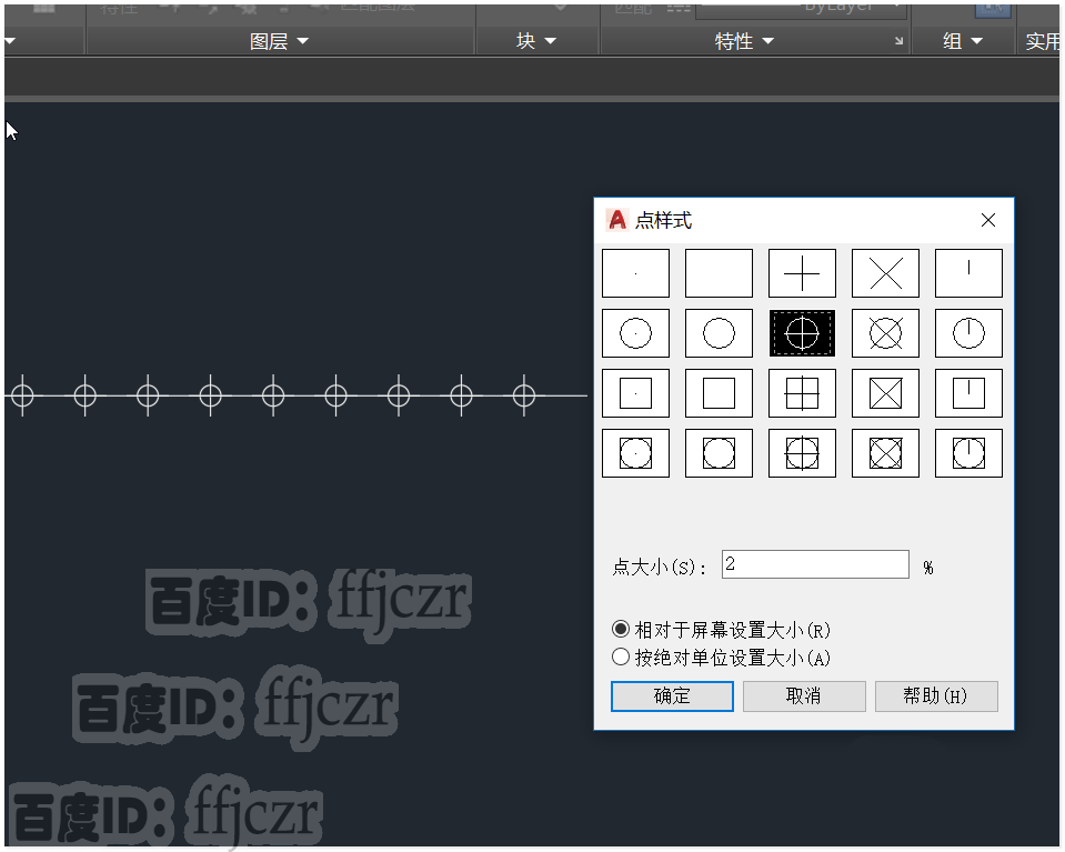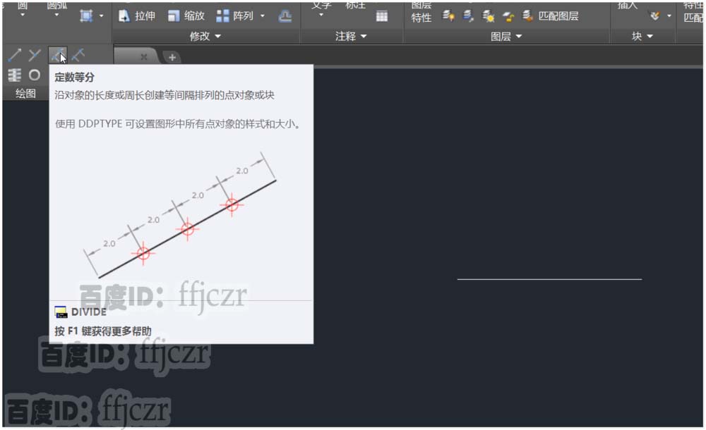 2、给直线进行定数等分,数量为14;完成后可能看不到所等分的点,可以在实用工具栏中选用点样式,修改默认的为带十字圆圈的样式。这样就可以清楚的看到等分出来的点了。