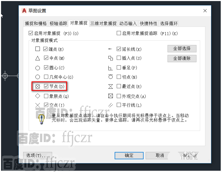 3、为了下一步的点捕捉,要开启自动捕捉命令,同时激活捕捉节点的选项。