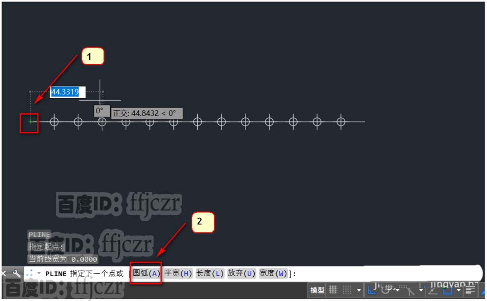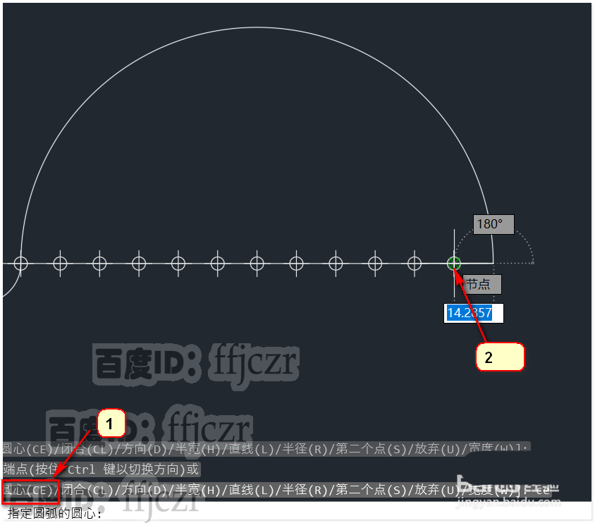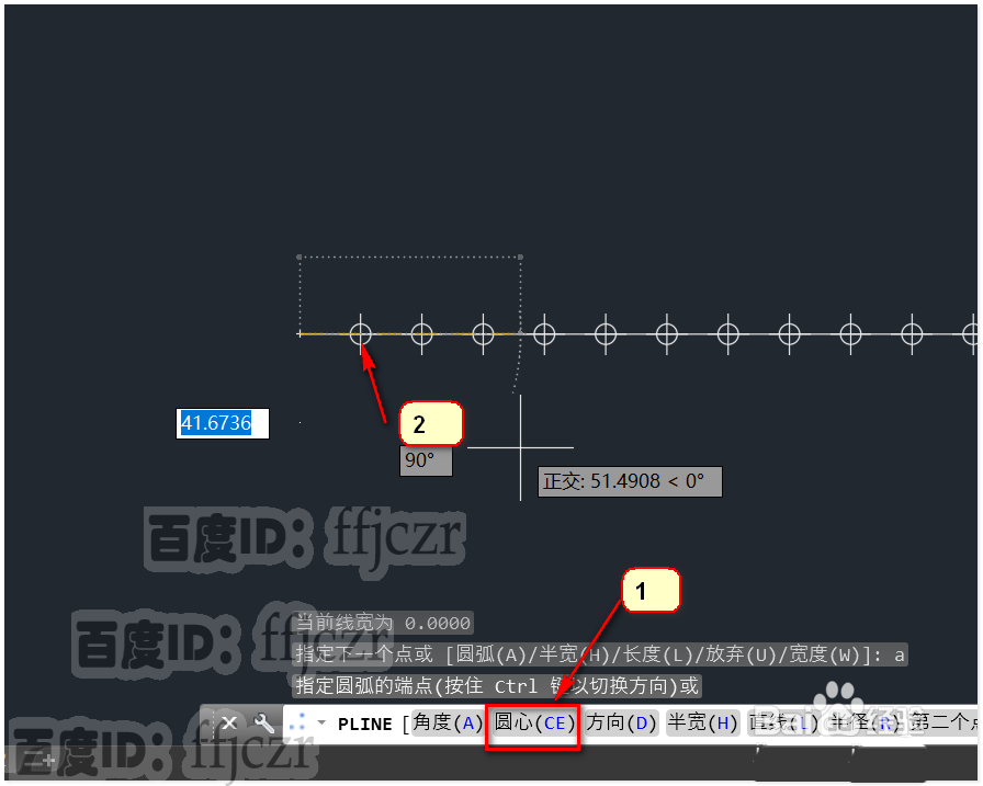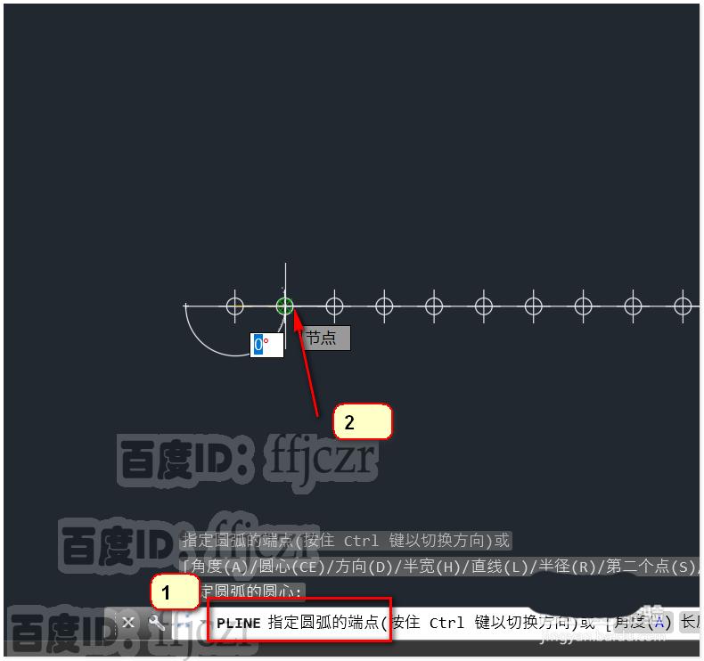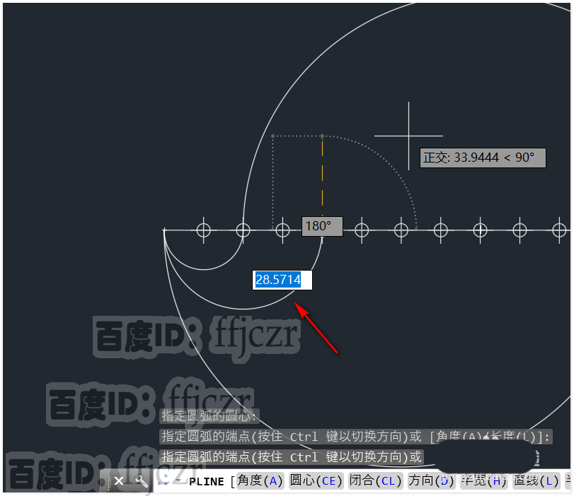 4、选择多段线命令(或键入PL),选取直线左边的第一个端点作为多段线的起始点;输入A更改多段线的样式为圆弧,输入CE选择第二个节点为圆弧的圆心,第三个节点为圆弧的终点。得到第一段圆弧。