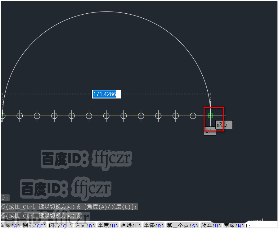 5、保持多段线激活的状态,在完成第一个圆弧的时侯直接选中直线的最右边端点,作为第二个圆弧的终点。