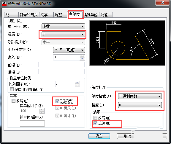4、点击【主单位】,把线性标注精度设为“0”,角度标注精度设为“0”,消零,勾选【后续】,然后【确定】如图所示。