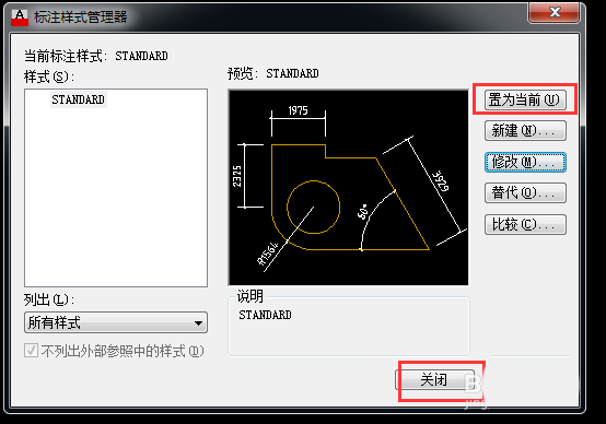 5、回到标注样式管理器对话框,点击【置为当前】-【关闭】