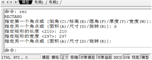 3、图层管理中单独图框为一个图层,以便修改管理。然后在绘制CAD图框中输入指令,如图所示建立矩形的框体。