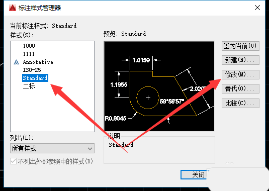 3、进入样式管理面板,找到标注样式(默认为当前样式),点击右侧修改。
