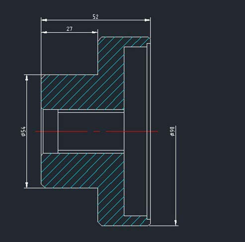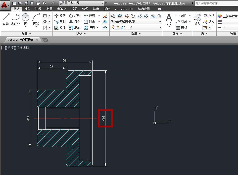 1、打开一个示例的图纸文档,准备将其中的尺寸“90”(图中红框),只显示下半段的尺寸线及尺寸界线