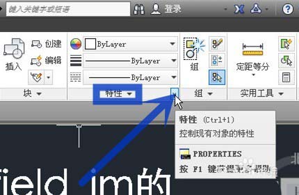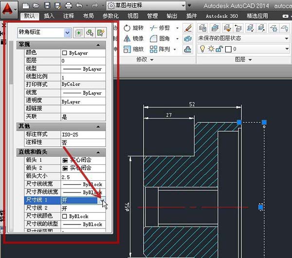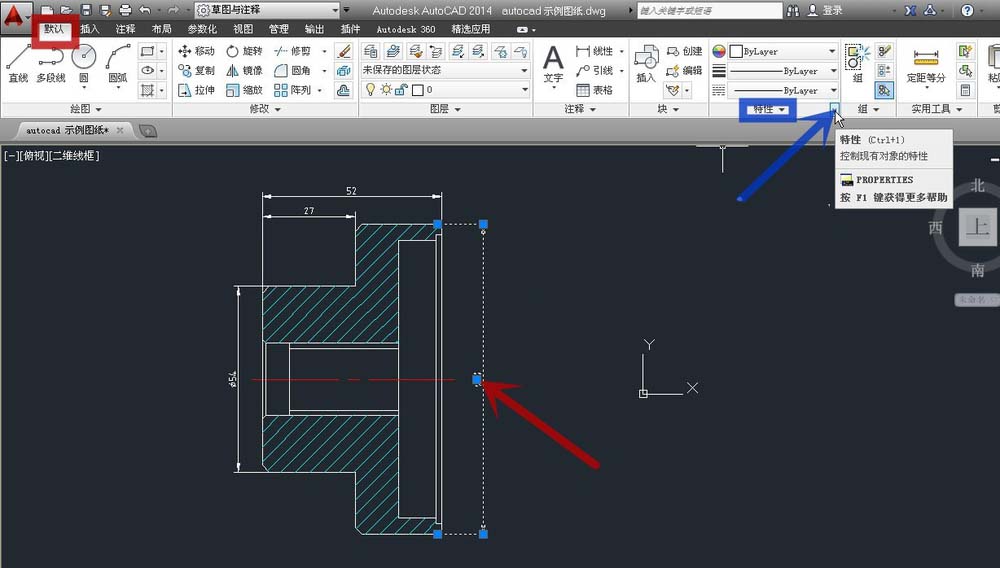 2、单击选中尺寸“90”(图中红色箭头所指)后,点击“默认”选项卡(图中红框)下的“特性”选项组(图中蓝框)的下拉箭头(图中蓝色箭头所指)