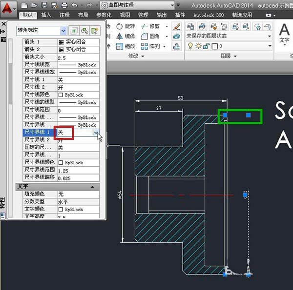 6、在弹出的菜单中选择“关”(图中红框),可见尺寸“90”的上半段的尺寸界线也不见了(图中绿框)