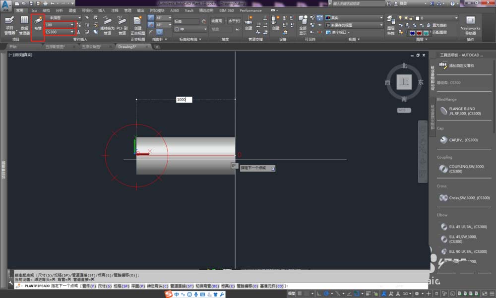 2、点击常用工具栏>布管,选择合适的管径和等级库。(等级库指的是不同材质不同标准的管道里面的管道大小、管件、紧固件、阀门等都不同)指定起点就可以布管了,在布管的过程中可以输入管道长度