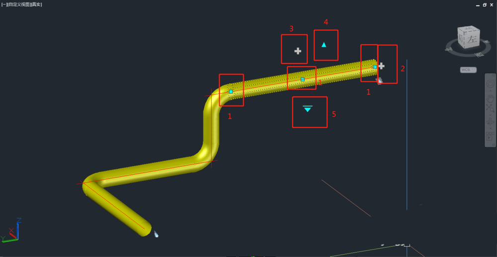 4、当你点击一段管道的时候会出现图纸所示的夹点,夹点1按住移动可以改变管道的位置的长度;夹点2可以继续进行布管;夹点3将会在直管上生成一个三通;夹点4可以改变管道的标高(你可以按Tab键切换BOP、COP、TOP确定标高);夹点5可以替换管件