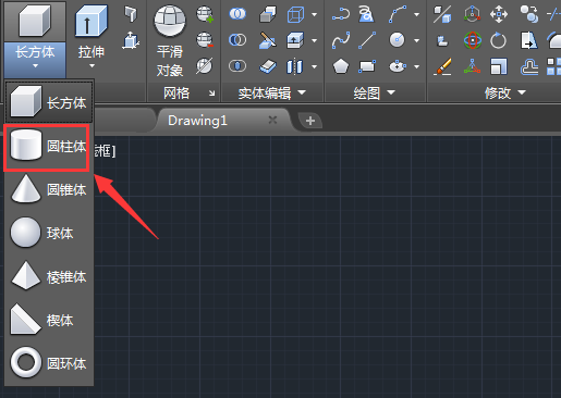 3、点击长方体右侧的下拉箭头,在其下拉菜单里找到圆柱体选项,如图所示:
