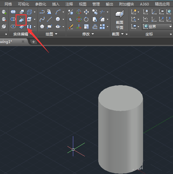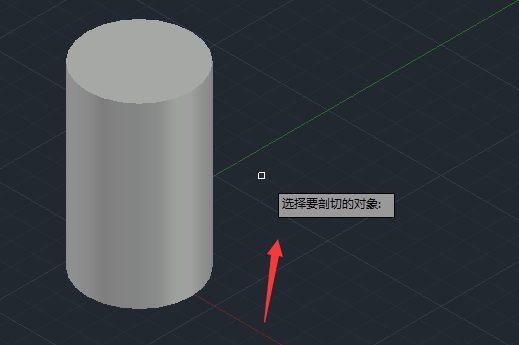 7、选择刚刚绘制的圆柱体,然后提示我们指定切面的起点,如图所示: