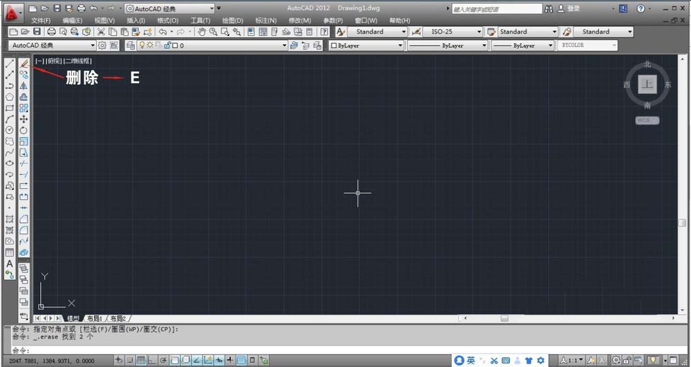 3、然后在命令提示窗口中输入E,之后点击空格键。这时可以用鼠标的左键选择需要删除的图形,如下图所示。