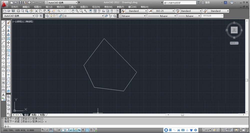 2、在命令提示窗口中输入L,随意绘制出一个五边形,输入C命令闭合。