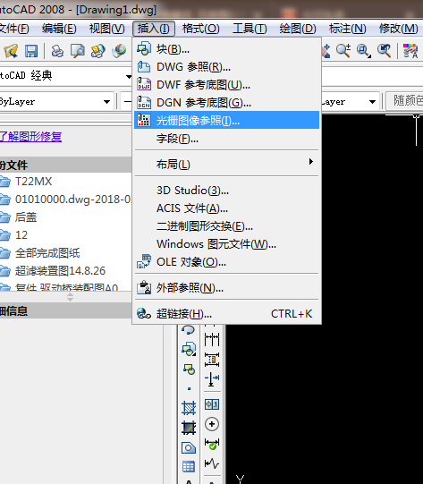 1、如下图所示,将鼠标放在工具栏插入上,点击下拉菜单中的“插入光栅像”,弹出对话框,