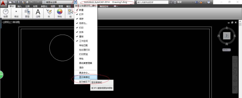 2、如图所示,点击自定义快速访问工具栏向下箭头。弹出下拉列表选项,选择"显示菜单栏"项。