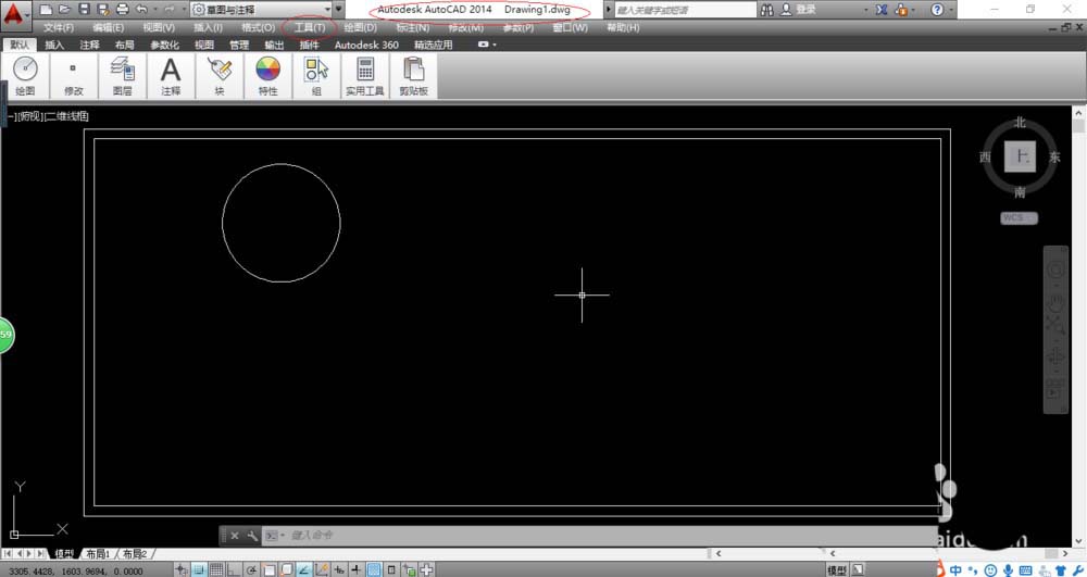 3、唤出"系统菜单栏"区,如图所示。点击"工具"图标,下步将进行启用动态输入绘图辅助功能的操作。