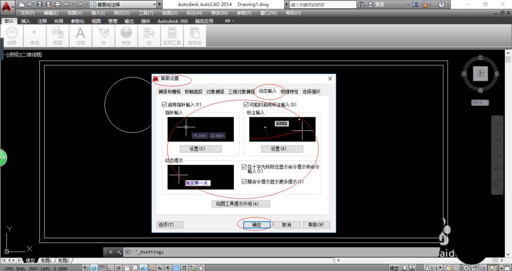 6、如图所示,完成启用动态输入绘图辅助功能的操作。本例到此结束,希望对大家能有所帮助。