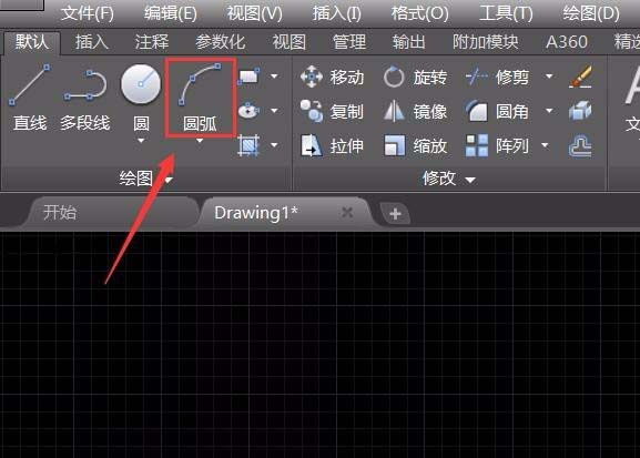 1、我们将CAD这款软件打开之后在常用菜单里找到圆弧选项,如图所示: