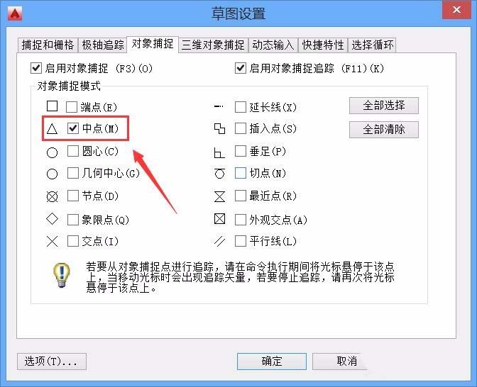 6、点击捕捉设置选项在弹出的对话框内我们选择中点,然后点击确定,如图所示: