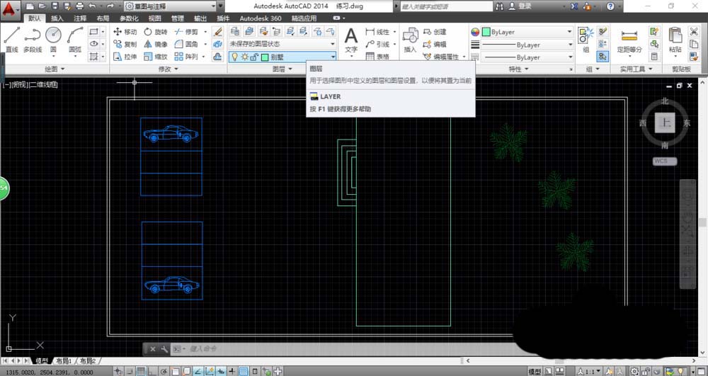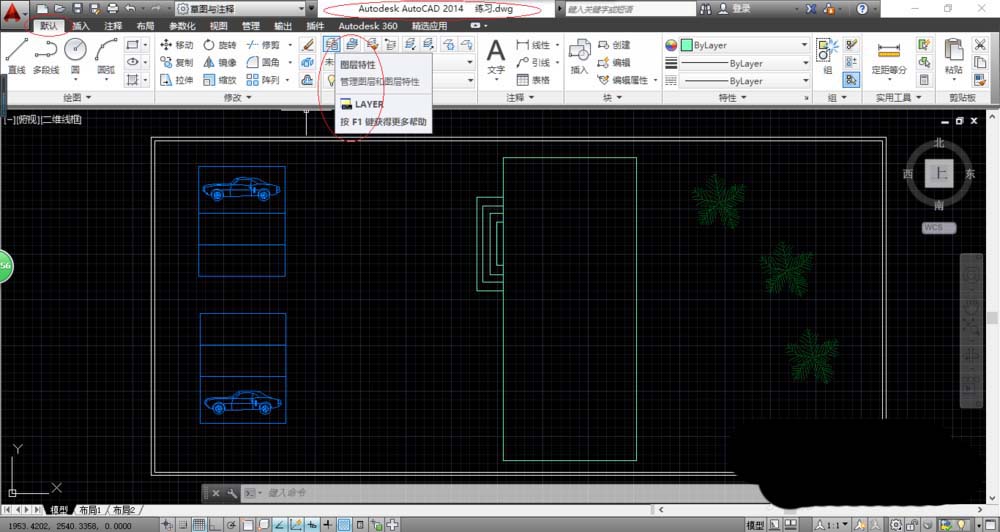 2、如图所示,选择"默认→图层"功能区。点击"图层特性管理器"图标,用于管理图层和图层特性。