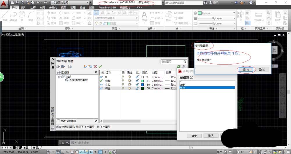 5、弹出"合并到图层"对话框,如图所示。显示"选定图层将合并到图层 车位,是否继续?"信息,点击"是"按钮。