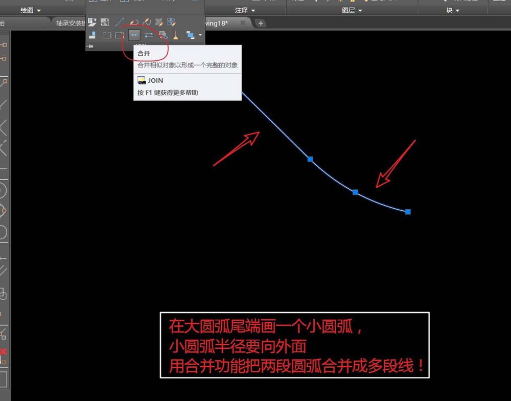 1、先画一个大圆弧。在大圆弧尾端画一个小圆弧,小圆弧半径要向外面,用合并功能把两段圆弧合并成多段线。