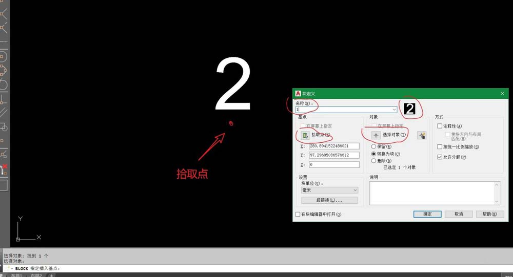3、编辑好文字了,要把文字创建成块,输入“B”回车,弹出块定义对话框,写上名称,选择对象为文字,选择拾取点为文字下方正中,点击确定。块就创建好了。