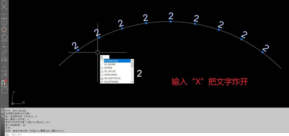 4、输入“DIV”选择要等分的对象:选择圆弧,跟据命令栏提示,输入“B”回车,输入块的名字回车。对齐和对象选择默认“Y”回车,输入需要的数量回车,文字就均分对齐了。