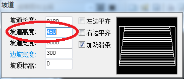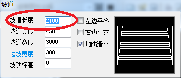 3、打开“坡道”编辑页面,并依次选择自己需要的“坡道长度”、“坡道高度”、“坡道宽度”、“边坡宽度”、“坡顶标高”、“加防滑条”,如下图所示