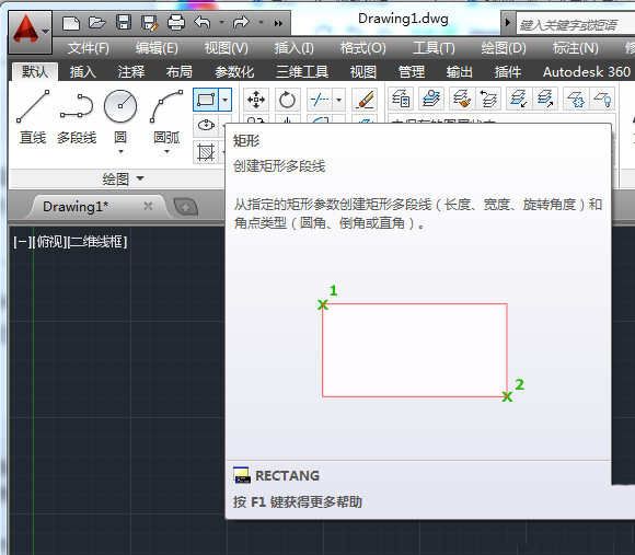 1、首先,通过菜单栏【默认】》【矩形】选项,绘制一个矩形图形。