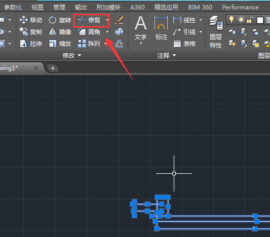 4、绘制好水沟的剖面图形线之后,再在修改里找到修剪命令,如图所示: