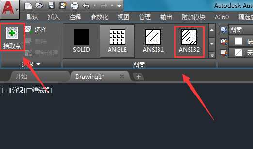 7、再在绘图里找到填充选项,点击该选项找到一种填充的图案,然后再找到拾取点选项,如图所示:
