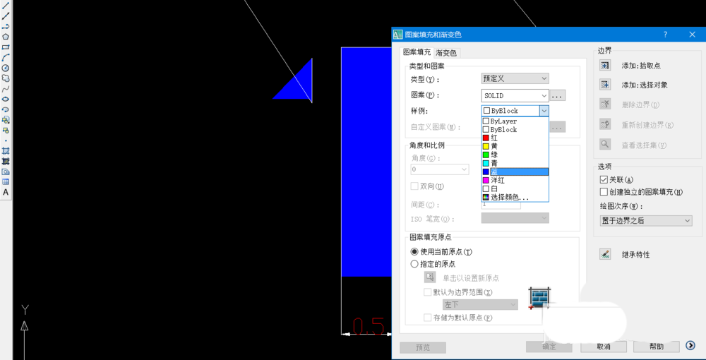 4、点击绘图工具栏中的“矩形”或直线按钮,绘制侧面正视图形,标注高度和宽度,点击背景按钮选择填充颜色,再选中边界即可为侧面正视图形设置背景颜色。