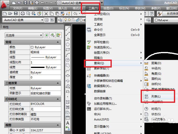 3、执行【工具】【查询】【列表】,或者输入“LI”,回车也行。