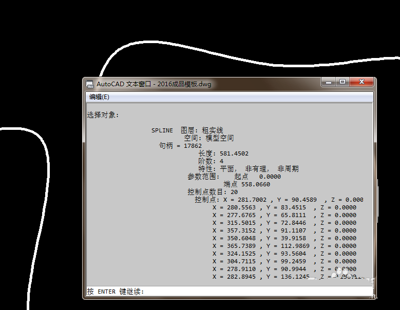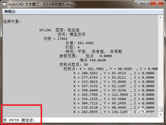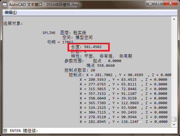 7、完成以上操作,我们就已经可以得出样条曲线的长度了,可以结束了,根据下图红色框选所示,继续“回车”,才能继续下去直至结束。