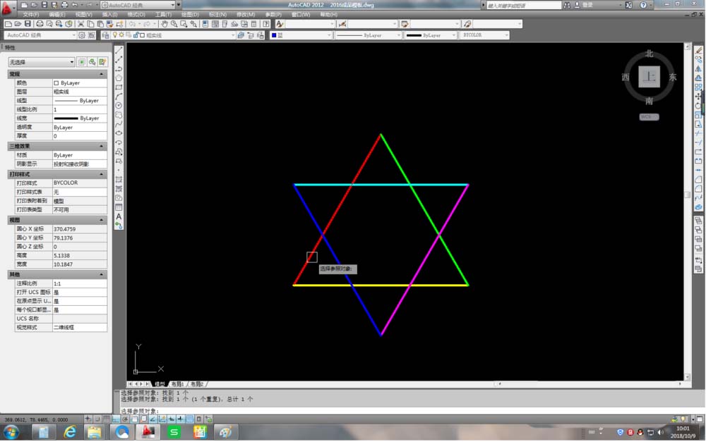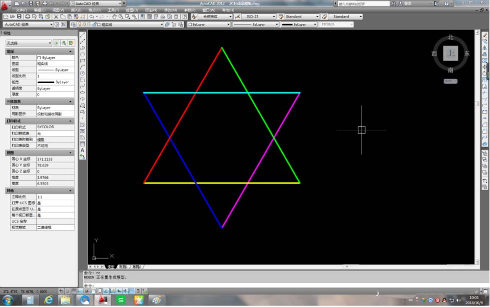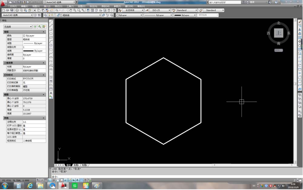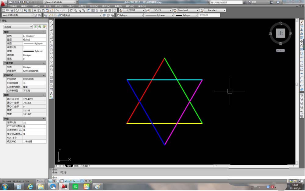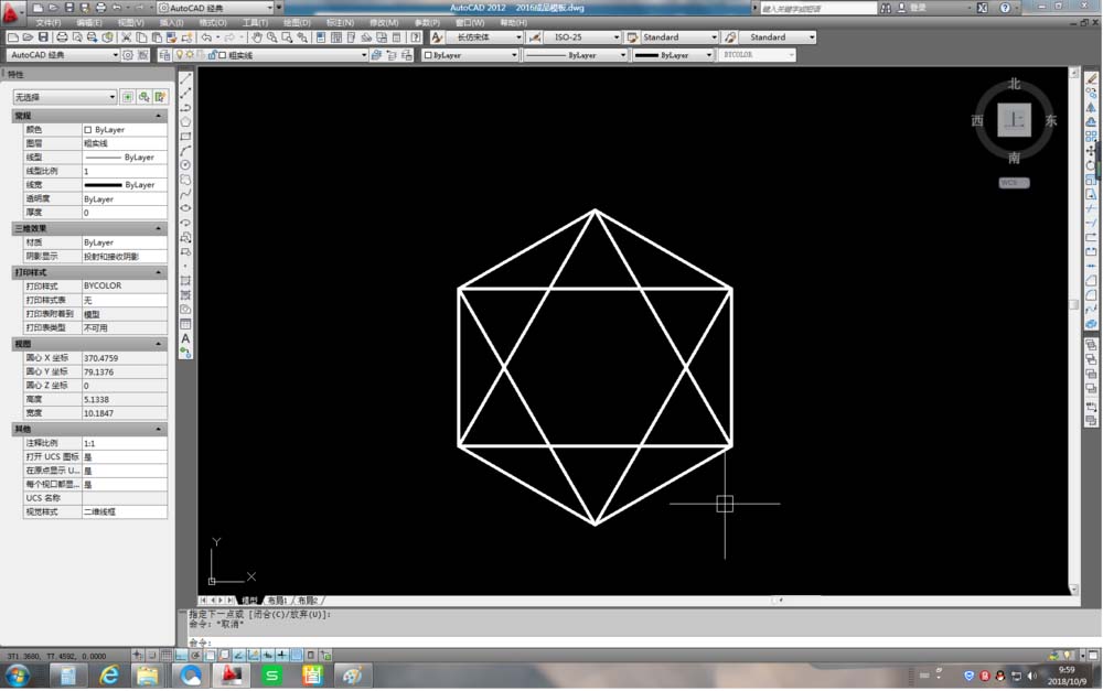 3、如下图所示,用直线命令,将正六边形两点相连,就成了两个相交的正三角形,六芒星的轮廓出现了。